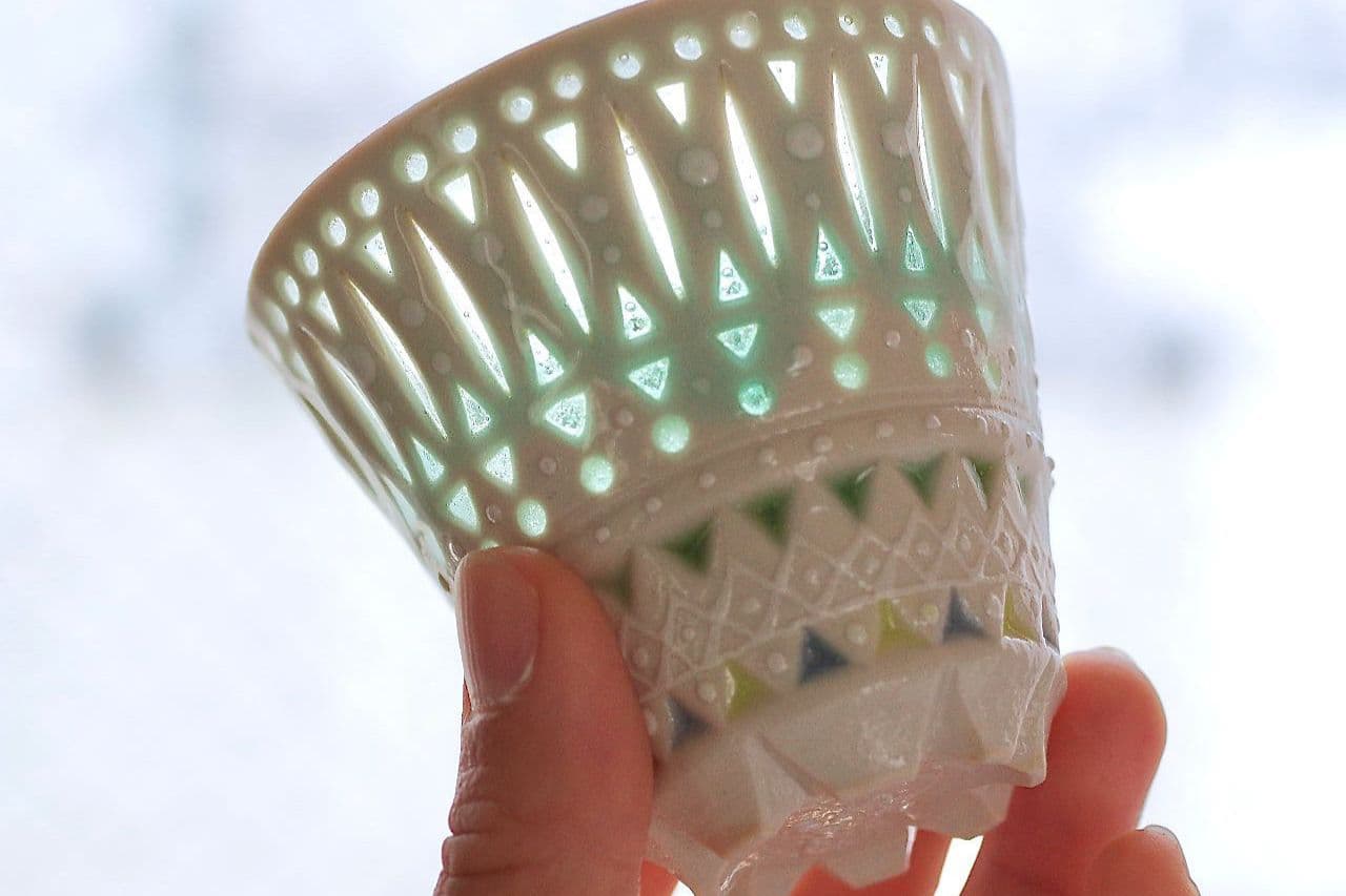 中にローソクやライトを入れて、溢れる光を楽しんだりする作品もありますが、二重構造にして器の表面を透し彫りにして楽しめる作品は、どこにもない、一点ものです。 ぜひ一度お手にとてください!