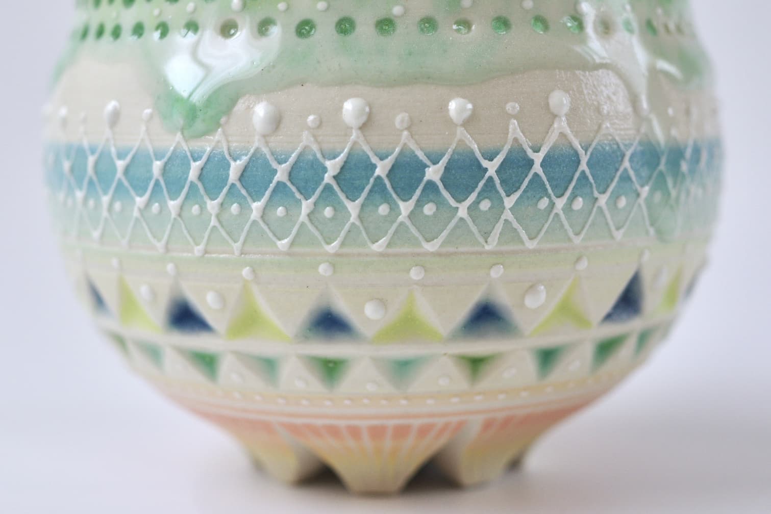 盛り上がった細い線は、どくどくの味わいと美しさがあり、粘土ならではの表現だと思っています。ぽこぽこ盛り上がった線描を楽しんで頂けますと幸いです。