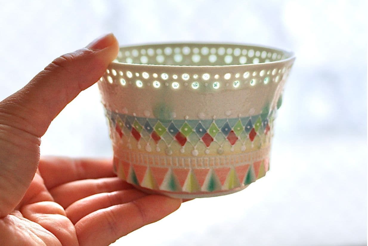 中にローソクやライトを入れて、溢れる光を楽しんだりする作品もありますが、二重構造にして器の表面を透し彫りにして楽しめる作品は、どこにもない、一点ものです。 ぜひ一度お手にとてください!