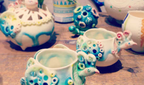 ということで、カメやトリ、花器などいつものカラフルな作品が並んでおります!